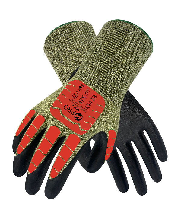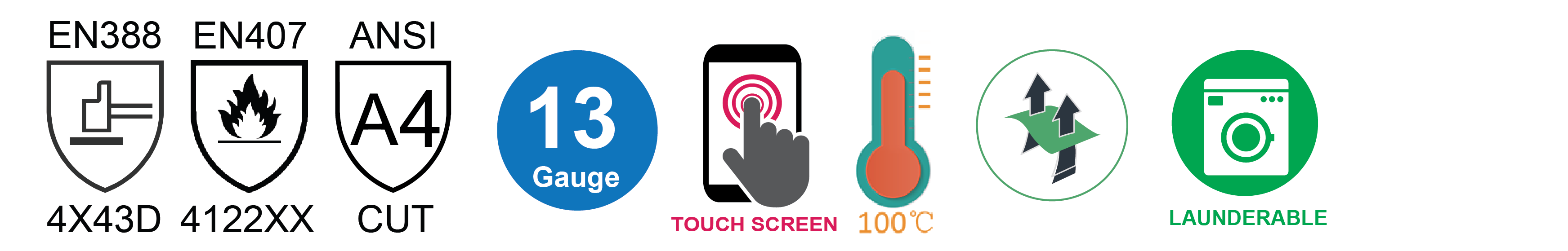 Flame resistant, cut level D/ANSI A4, contact, convective and radiant heat protection.