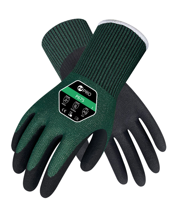 High quality 13 gauge cut level E/ANSI A5 glove with sandy nitrile coating.